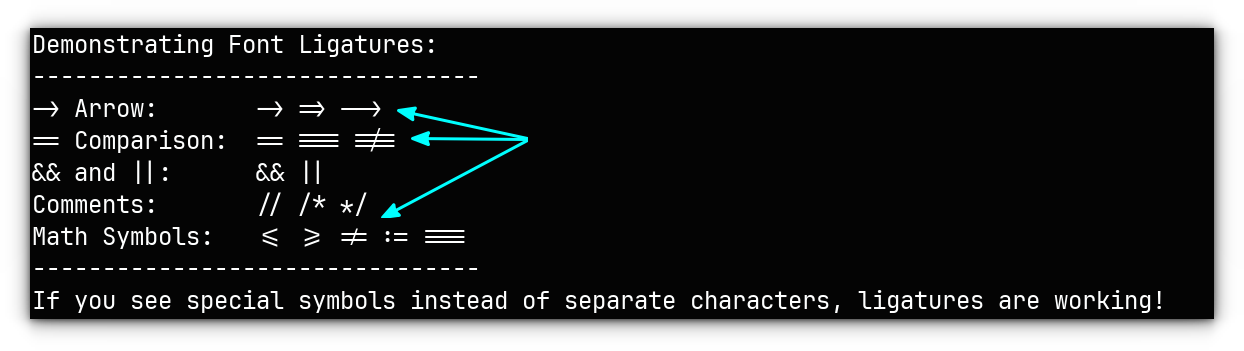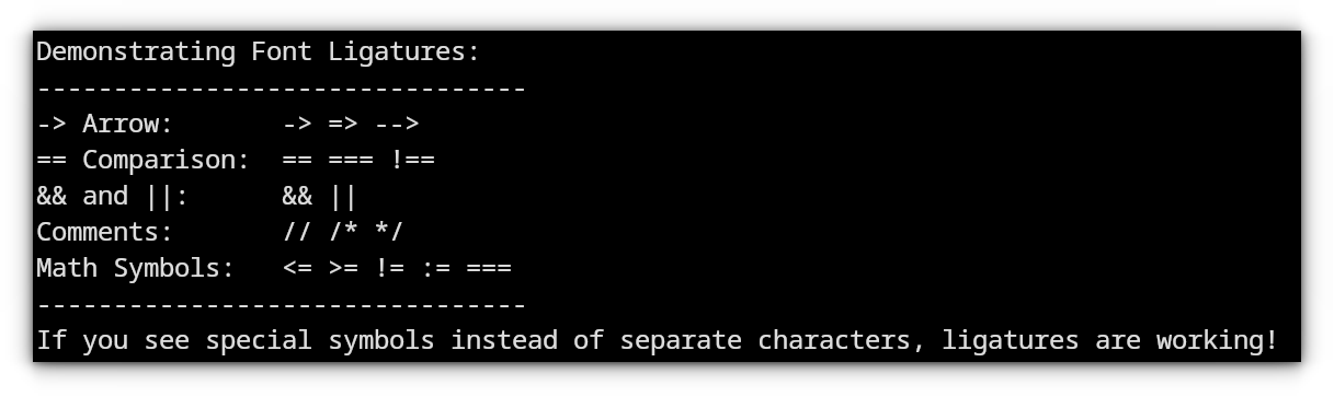 If you are into coding, there are symbols that are a combination of two symbols. Let’s say, “Not equal to”, usually denoted as != but mathematically displayed as ≠ . Now, with a ligature supported terminal, you will get the proper symbol for this operation. See the difference for yourself.The Ghostty team itself provides a convenient example of how this works: