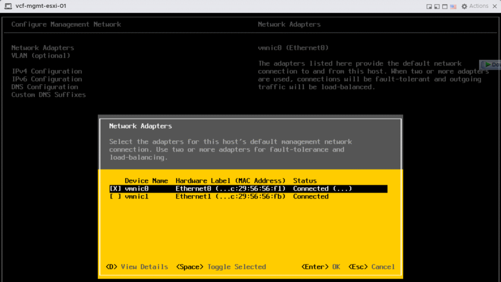Under the “Configure Management Network”, choose the right adapter for ESX host management vMKernel interface and enter ESX management VLAN ID.