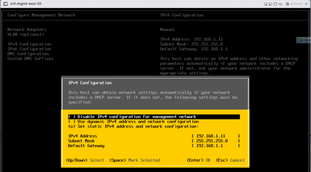 Next, you will need to configure a static IP address for the ESX host, along with the netmask and gateway for your ESX management VLAN.