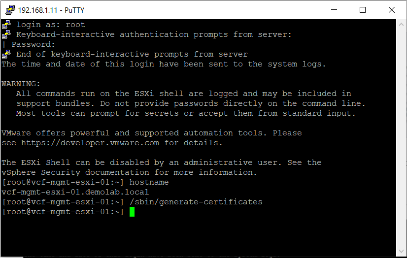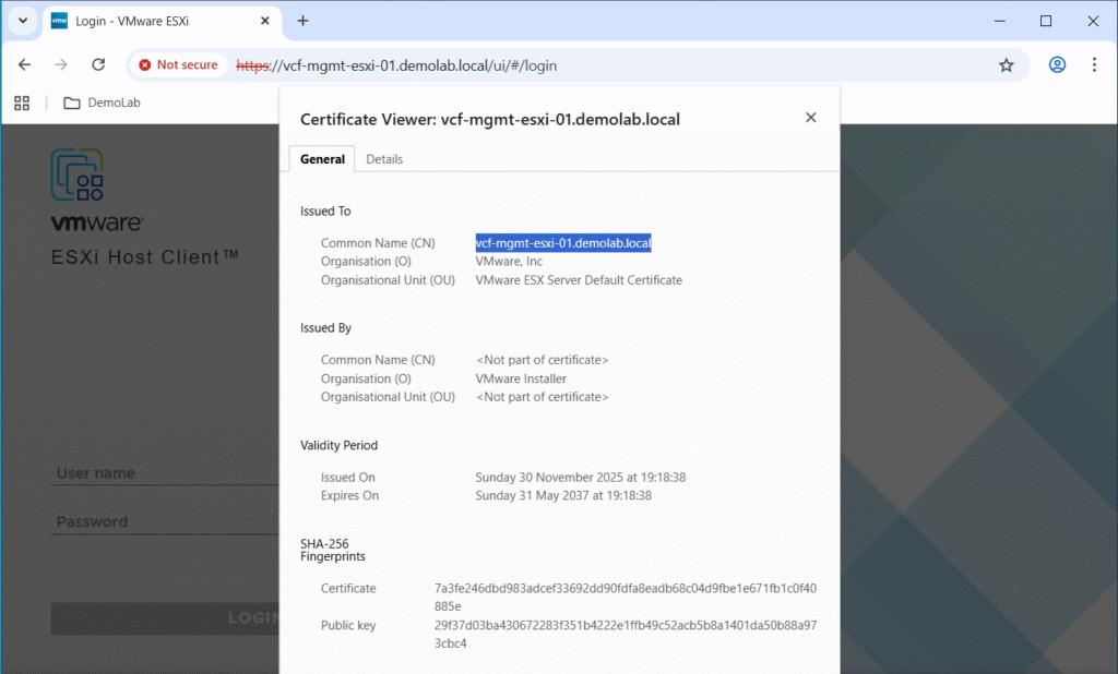 All communication between the VCF Installer and the ESX hosts is performed securely over HTTPS and as a result it validates the identity when making a connection by comparing the common name of the certificate against the FQDN provided within the VCF Installer deployment wizard.