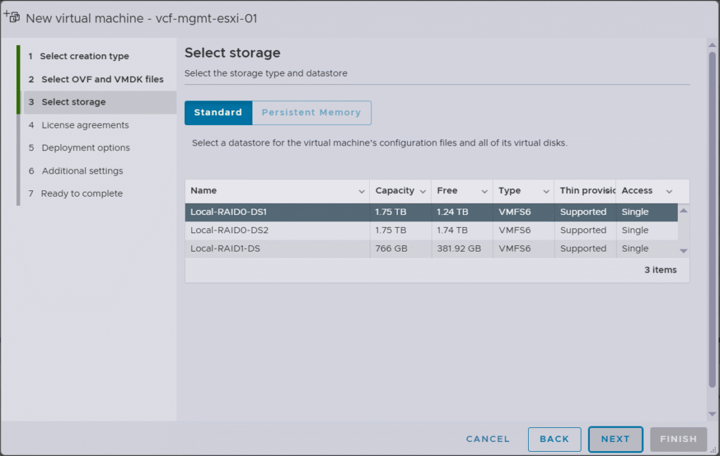 As I am planning to use vSAN ESA, I am using NVMe controller for all disks. ESX is installed on a 32GB disk while 1TB disk per host will be claimed by the vSAN ESA during bringup.