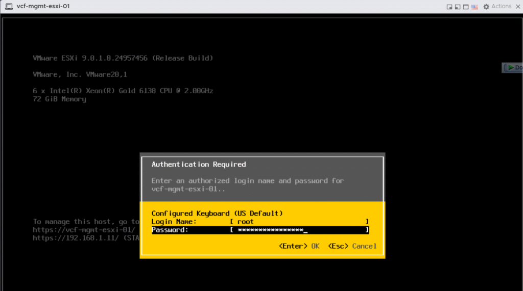 Login to nested ESX host DCUI interface using root and the default VMware1! password.