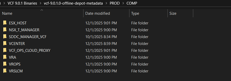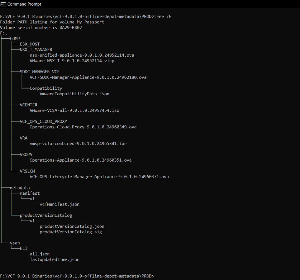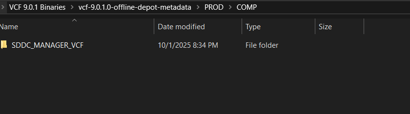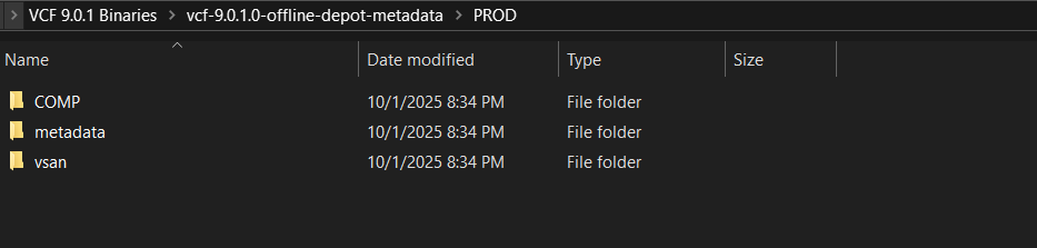 Extract the vcf-9.0.1.0-offline-depot-metadata.zip file which contains the folder structure for setting up VCF Offline Depot along with the required metadata files for VCF 9.0.1.