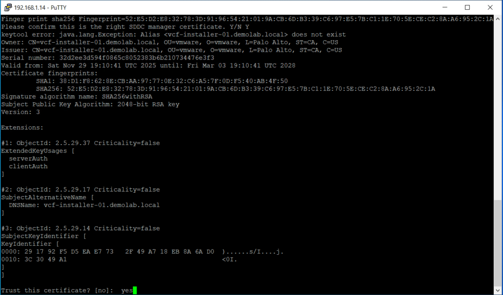 Next you need to trust the certificate of the VCF installer and it will be added to the Keystore automatically.
