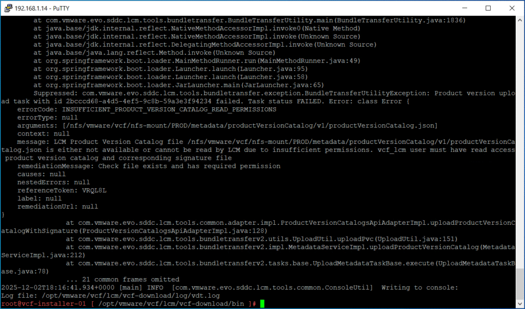 I got the above error. After checking the log file /opt/vmware/vcf/lcm/vcf-download/log/vdt.log, it seems that vcf_lcm does not have permissions to read the product version catalog and signature files. So, I set the same permissions as in step 6 for the PROD folder we uploaded to /nfs/vmware/vcf/nfs-mount/.