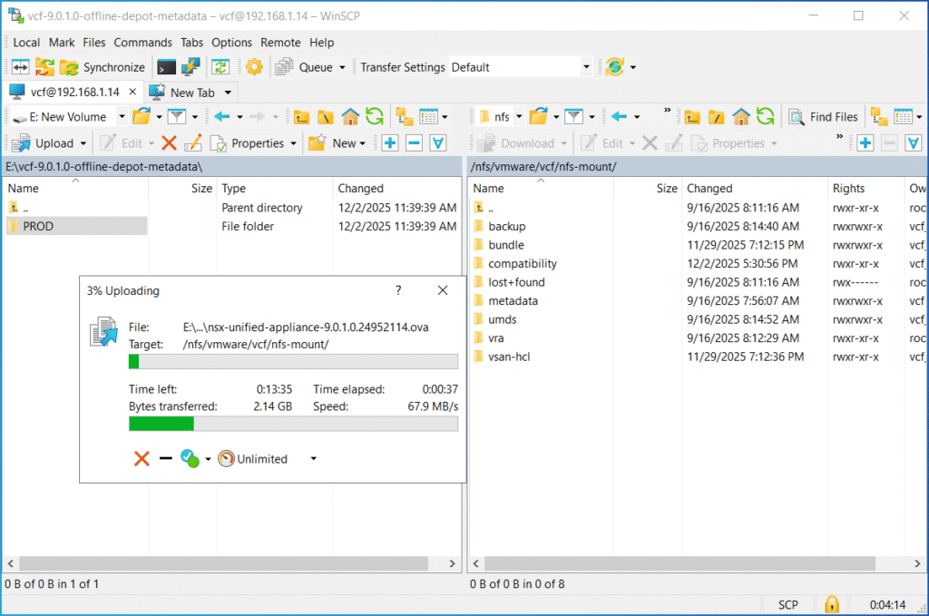 Now you need to transfer the PROD directory to the VCF installer appliance (for example using WinSCP tool). You can select any location on the VCF Installer appliance that has enough free space available. In my case, I will be choosing /nfs/vmware/vcf/nfs-mount/.