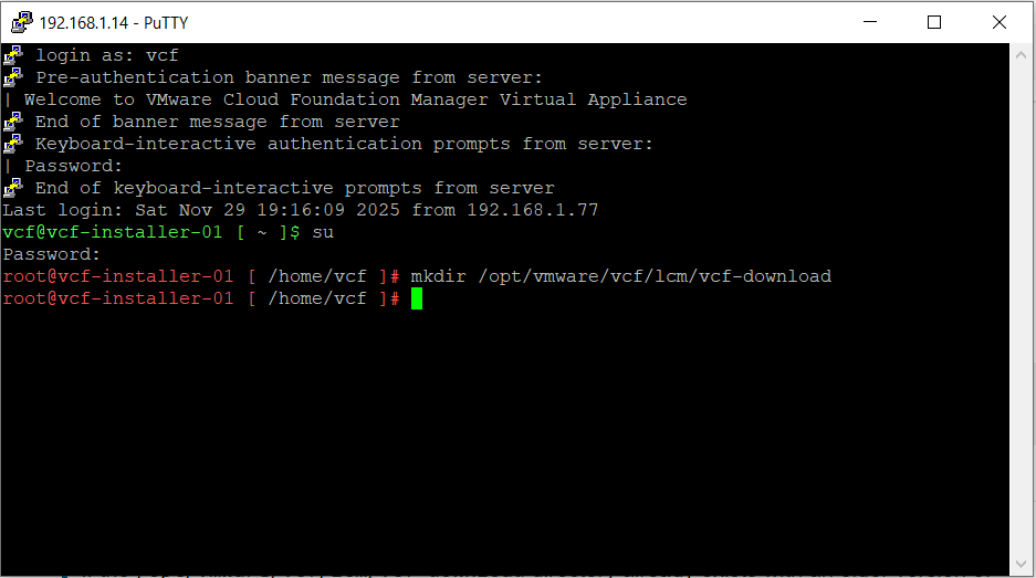 Enter su to switch to the root user, then create the vcf-download directory.