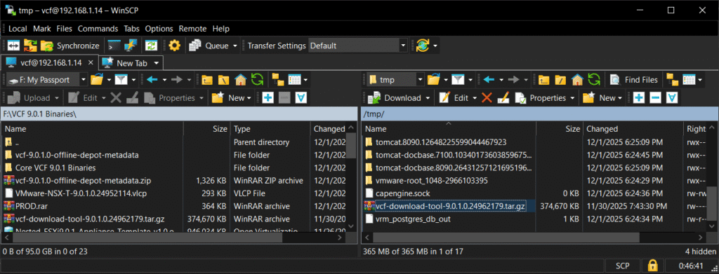 Using WinSCP, connect to VCF installer appliance using vcf user account, then copy the VMware Cloud Foundation Download Tool file (vcf-download-tool-9.0.1.0.24962179.tar.gz) to the /opt/vmware/vcf/lcm/vcf-download directory.
